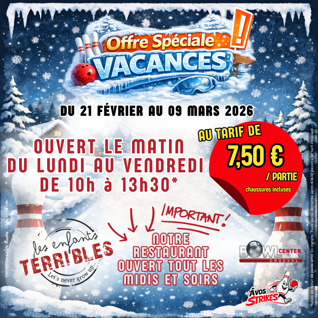 * Tarif vacances : 7,50€ la partie (jusqu’à 13:30) – Chaussures incluses