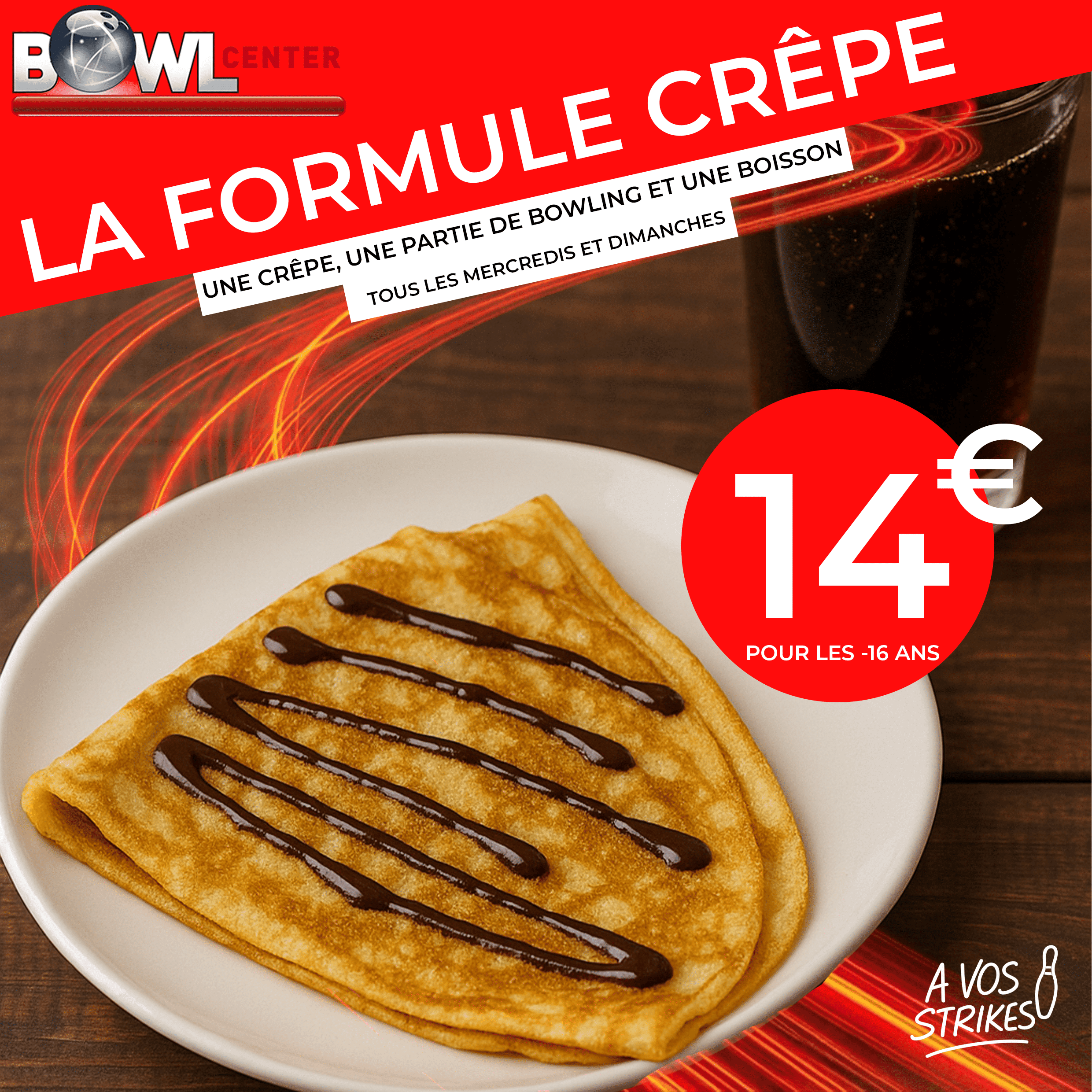 Découvrez notre offre spéciale dédiée aux moins de 16 ans entre 14h et 18h: une crêpe gourmande, une boisson rafraîchissante et une partie de bowling pour seulement 14 €.